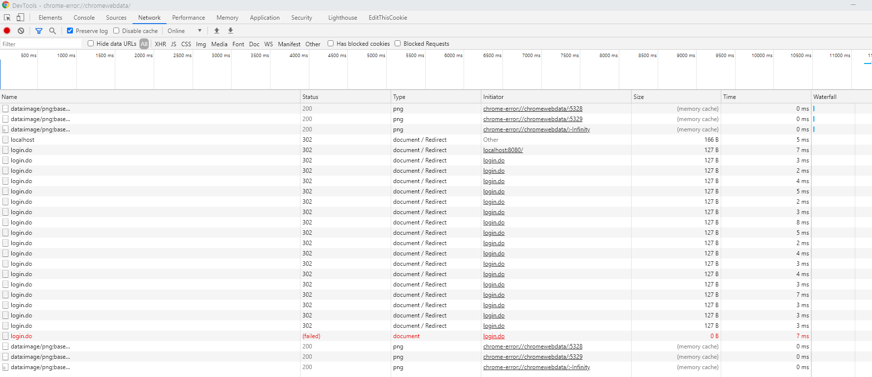 크롬 에러 화면 및 각 브라우저의 네트워크 현황 이력에서도 알 수 있듯이, /login.do로의 호출이 계속 반복되어서 브라우저가 스스로 동작을 중지하는 오류(Found 302)가 발생하였습니다.